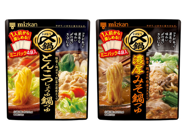 株式会社Mizkan (本社:愛知県半田市、代表取締役社長兼CEO:吉永 智征、以下:ミツカン)は8月2日(水)より「〆まで美味しい 濃厚みそ鍋つゆミニパック」「〆まで美味しい とんこつしょうゆ鍋つゆミニパック」を新発売いたします。また、新たに「〆(シメ)鍋」ロゴを作成し、ブランド全体としてパッケージリニューアルを実施します。