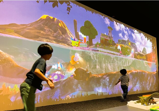 紙に描いた絵が動き出す不思議な海の世界に、“海の王者”とも呼ばれる巨大は虫類「モササウルス」が出現します。また海中に現れる不思議なタマゴに手でタッチすると、中から赤ちゃん恐竜が現れる演出が楽しめます。