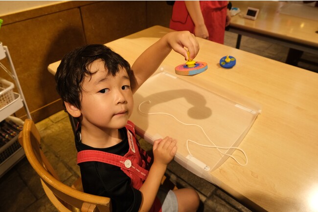 参加したお子様方は、古くから親しまれているおもちゃの一つであるコマについて学びながら、ペインティングの面白さや回転時の色の変化などを楽しんでいました。