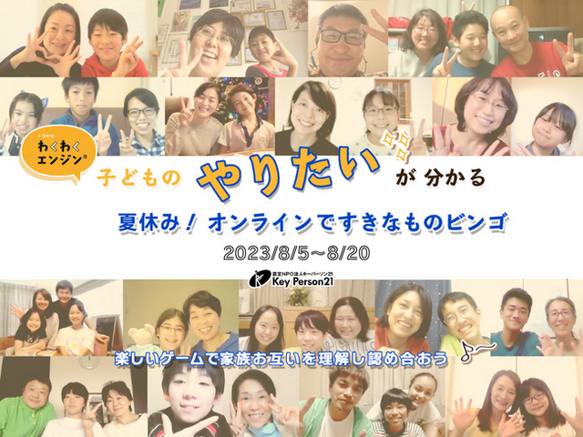 認定NPO法人キーパーソン21(神奈川県川崎市、代表:朝山あつこ)は8月5日から8月20日に、子どもが本当は何をやりたいのか、が分かるキャリア教育プログラム『オンラインですきなものビンゴ』を開催します。本プログラムはzoomによるオンラインでの約120分間で、キーパーソン21のサポーターと一緒に楽しくゲームをする中で親子の対話が生まれます。子どもは自分の「わくわくすること」を見つけ、親は子どもの何を応援すればよいのかがわかります。プログラムは、一家族ごとの参加なので、安心して対話を楽しめます。夏休みという家族で過ごす時間があるときこそ、体験してみませんか。また体験者限定の保護者向けフォローアップコミュニティ『わくわくエンジン活用倶楽部』も展開します(9月~半年間)。わくわくエンジンの発見を日常の行動へつなげていきます。
