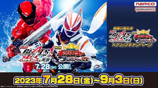 株式会社バンダイナムコアミューズメントは、映画『仮面ライダーギーツ 4人のエースと黒狐』、映画『王様戦隊キングオージャー アドベンチャー・ヘブン』の公開を記念して、映画グッズがもらえるキャンペーンを、全国約70店舗のアミューズメント施設「namco」で2023年7月28日(金)~9月3日(日)まで開催します。