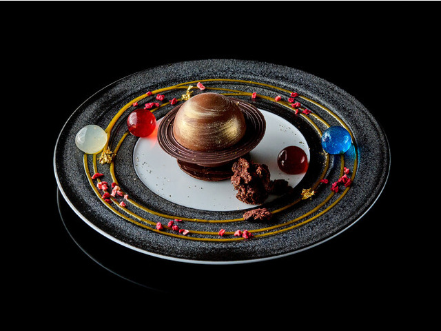 マンゴーのソースにフリーズドライのイチゴやフランボワーズを散りばめた、無限の宇宙を想起させるプレートの中央には、ベリーソースを忍ばせ土星を模ったチョコレートムース。高級ミルクチョコレート”ジヴァラ・ラクテ”を使用しており、コクのある甘味をお楽しみいただけます。周りのゼリーは惑星をイメージ。レモン、ストロベリー、紅茶、ブルーキュラソーの4色の寒天ゼリーです。土星と惑星は盛り付けずに創作パーツとしてお届けします。