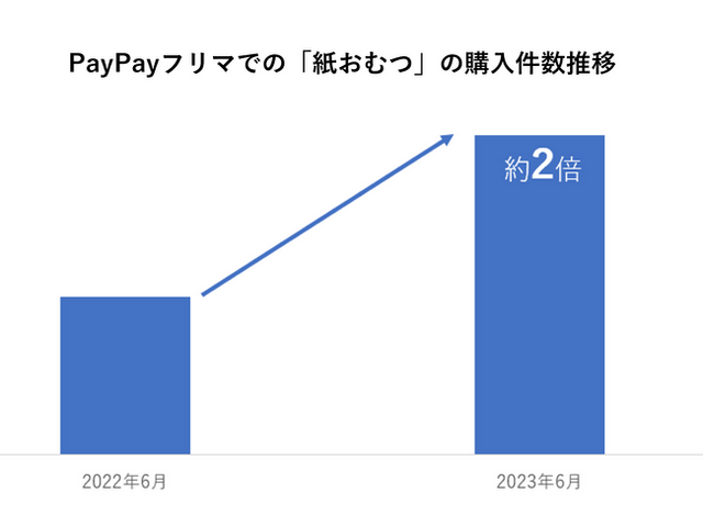 「PayPayフリマ」では、これらアイテムの購入件数が増加しており、「紙おむつ」は、2023年5月、6月と2カ月連続で昨年比約2倍、「ベビー服、シューズ」は、昨年比で2023年5月は約1.8倍、6月は約1.7倍、「べビー、キッズ用おもちゃ」も、昨年比で2023年5月は約1.8倍、6月は約1.7倍に増加しています。