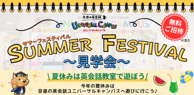 サマーフェスティバルにご参加いただいた後にユニバーサルキャンパスにご入室いただいた方には、8月9月の月謝が無料となる特典があります。子どもが楽しく英会話をスタートできる機会をお探しの方や、夏休み期間中に英語に触れる体験をさせたいとお考えの方が、気軽に参加いただけるイベントです。京進では、英語教育を通じて、英語をコミュニケーションの道具として使うことのできる、グローバル社会で活躍できる人を育てるため、様々な学習メニューと学習環境の提供に取り組んでいます。