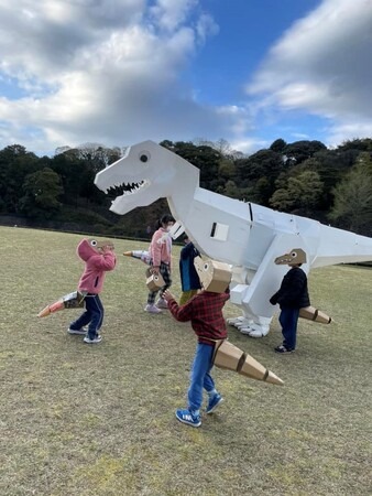 ■内容:「工房ヒゲキタ」様による段ボールでミニ恐竜を作るイベントと、お散歩着ぐるみ外骨格恐竜「うちのシロ」と一緒に店内を散歩するイベントです。