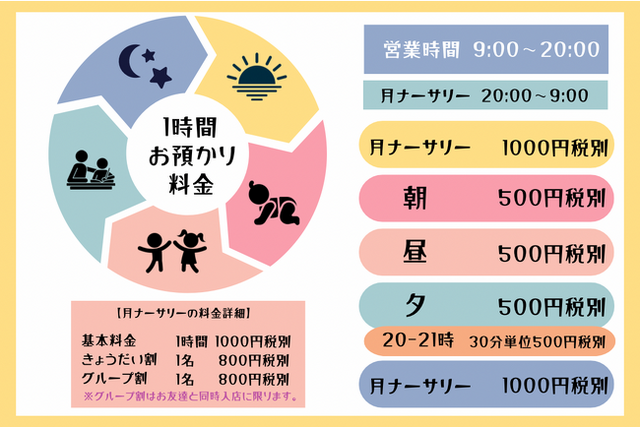 通常営業時間外20:00~9:00まで完全予約制で1,000円(税別) となりますが20:00前からの預かりで最終営業時間に遅れてのお迎えに限り、20:00~21:00については、30分単位:500円(税別)の予定となっており、より一層便利に忙しいママ・パパのためのニーズを捉えたサービス価格に設定しております。