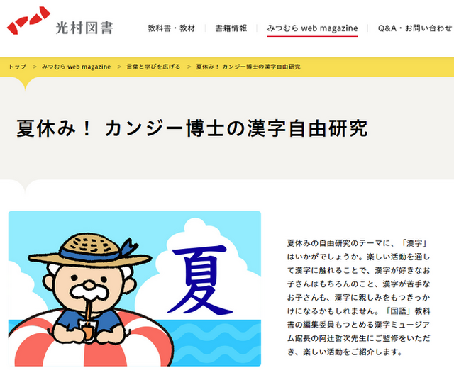 「夏休み! カンジー博士の漢字自由研究」は、恒例となった夏休みの保護者向けコンテンツの新企画です。