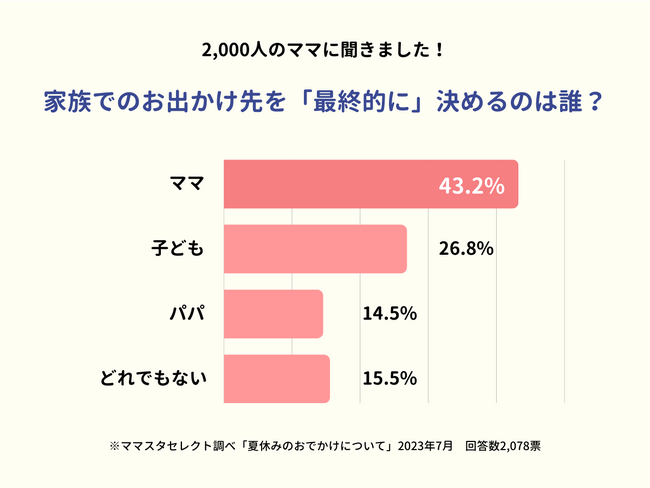 家族でのお出かけを計画している家庭も多いであろう夏休みを前に、ママスタセレクトでは「家族でのお出かけ先を“最終的に”決めるのは誰?」というアンケートを実施。「子どもの意見で決める」「ママが決める」「パパが決める」「どれでもない」の4つの選択肢を設定したところ、2,000人を超える回答が集まりました。