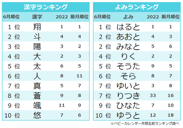 6月に生まれた男の子の名前の漢字ランキングTOP3は、1位「翔」、2位「斗」、3位は「陽」となり、TOP10には年間を通じて人気のある漢字がランクインしていました。また、女の子の名前ランキングでも人気のあった「葵」が5月32位から6月は18位にランクアップしていました。