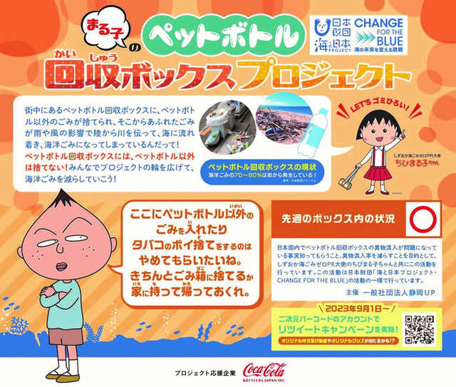 一般社団法人静岡UPは、2023年7月25日(火)に「まる子のペットボトル回収ボックスプロジェクト」のキックオフイベントを開催いたします。しずおか海ごみゼロPR大使を務める「ちびまる子ちゃん」と一緒に、全国的な海洋ごみの課題に対して”まる子と全力解決する静岡県”の活動内容を発表します。イベントを通して「まる子のペットボトル回収ボックスプロジェクト」の活動内容の理解を深めてもらい、設置されたパネルの回遊意識を高めてもらうことを目的としています。このイベントは、日本財団が推進する海洋ごみ対策プロジェクト「海と日本プロジェクト・CHANGE FOR THE BLUE」の一環で開催するものです。