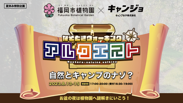 キャンプのある自然な暮らしをプロデュースするキャンプ女子株式会社(本社:福岡市、代表:橋本華恋)は、福岡市植物園(所在地:福岡市中央区)にて、親子謎解きウォーキング『アルクエスト』と特別コラボ!夜の植物園内にはイベントのためのキャンプエリアが登場!都心にいながら、自然×キャンプ×謎解きしながら楽しもう!