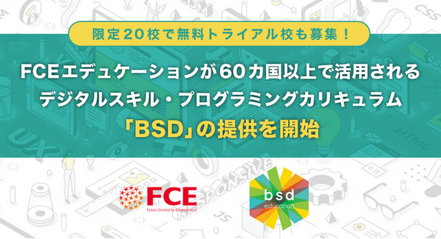 教育事業を運営する株式会社FCEエデュケーション(所在地:東京都新宿区/代表取締役:尾上幸裕、以下FCE)は、iJapan株式会社(所在地:東京都千代田区/代表取締役:笠間和喜)と提携し、60カ国以上、約90,000人の子ども達にデジタルスキルを学ぶ機会を届けるために開発されたカリキュラム『BSD(Build Something Different)』の提供を開始します。また、これを機に20校限定で本カリキュラムの無料トライアル導入校を募集します。