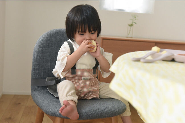 お子様をひざの上でお座りさせて、チェアベルトで固定すれば、パパママは両手が使えてお食事サポートがらくらく。慌ただしいお食事も、ぐんとスムーズになります。