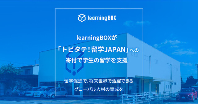 eラーニングシステムの開発・運営を行うlearningBOX(ラーニングボックス)株式会社(本社:兵庫県たつの市、代表取締役社長:西村 洋一郎)は、官民協働のもと社会総掛かりで取り組む留学促進キャンペーン「トビタテ!留学JAPAN」(https://tobitate.mext.go.jp/ )に寄付いたしました。この寄付金は、日本の高校生・大学生の留学支援等グローバル人材の育成に役立てられます。
