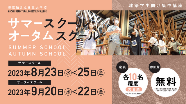 建築家・隈研吾氏が校長を務める高知県立林業大学校(高知県香美市)は、建築を専攻する学生の方々に向けて高知の森林と木造建築を学ぶサマー&オータムスクールを開催いたします。サマースクールは令和5年8月23日(水)~8月25日(金)、オータムスクールは令和5年9月20日(水)~9月22日(金)の日程での実施です。それぞれ3日間のプログラムは、本校の授業聴講はもちろん、隈校長が手がけた梼原町の建築や高知の木造建築の見学、森林・林業体験など、充実の内容となっています。サマー、オータムともに同じ行程となりますので、ご都合のつく日程でご参加いただけます。これからの木造建築を担う皆様に、高知でお会いできるのを楽しみにしております。