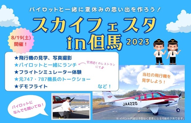 パイロット育成事業をおこなう株式会社FLIGHT TIME(本社:東京都港区、代表:谷口一貴)は、8月19日(土)に兵庫県のコウノトリ但馬空港で『スカイフェスタin但馬』を開催いたします。