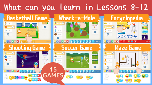 英語版:eJrプログラミングは、未経験者でもプログラミングを指導できる教材です。レッスン動画をモニターやプロジェクターなどで投影して見せれば、子どもたちは自らゲームやデジタル絵本などのプログラミングを行い、自分の作った作品の発表を行うことが出来できる構成となっております。