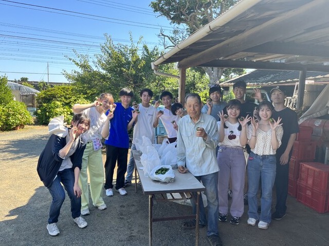 7月25日(火)に東海大学教養学部/人間環境学科 社会環境課程の万城目ゼミの万城目教授とゼミ生11名で大磯の二挺木農園を訪れた学生たちは、農園主の二挺木さんから湘南エリアのみかん農業の歴史や課題について学び、34℃を超える炎天下の中、実際に摘果作業も体験しました。