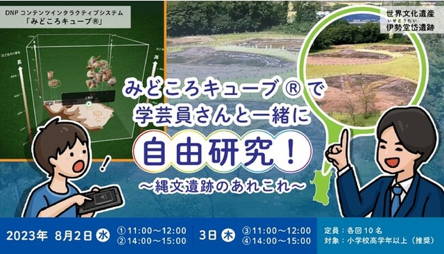 DNPはこのイベントで、デジタル庁によるワークショップ「デジタル自由研究~おうちでできるデジタル体験~」に協力企業として参加します。秋田県北秋田市にある世界文化遺産「伊勢堂岱(いせどうたい)遺跡」の出土品や縄文文化を学ぶオンラインワークショップ「みどころキューブで学芸員さんと一緒に自由研究!~縄文遺跡のあれこれ~」を開催します。