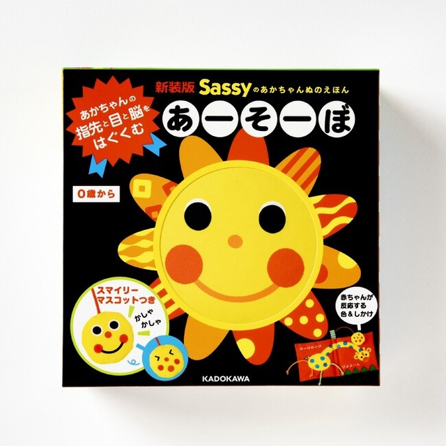 発達心理学研究に基づいた「左右対称のにこにこ顔」「規則正しい模様」「強いコントラストの配色」をちりばめ、赤ちゃんをくぎづけにする「Sassyのえほん」シリーズ。
