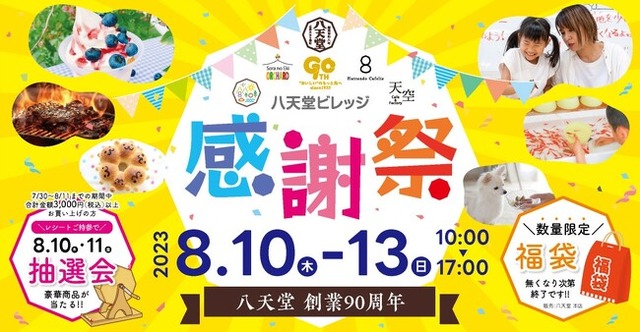 株式会社八天堂(本社:広島県三原市、代表取締役:森光孝雅)は、広島空港前に展開する体験型食のテーマパーク「八天堂ビレッジ」で、2023年8月10日(木)~13日(日)に感謝祭イベントを開催します。『八天堂の日』として記念日登録認定されている8月10日(木)から週末にかけて、今年は八天堂創業90周年のアニバーサリーイヤーならではの特別イベントを盛りだくさんに企画しました。