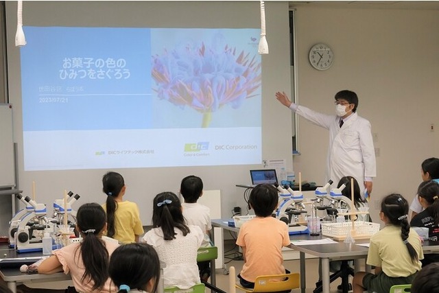 DIC株式会社(本社:東京都中央区、社長執行役員:猪野薫)およびDICライフテック株式会社(本社:東京都中央区、代表取締役社長:竹見孝弘)は、チロルチョコ株式会社(所在地:東京都千代田区、代表取締役社長:松尾裕二)協力のもと、青色の食用色素を持つ食用藍藻類「スピルリナ」を題材とした小学生向けの食育授業を世田谷区立教育総合センターで7月21日に開催しました。
