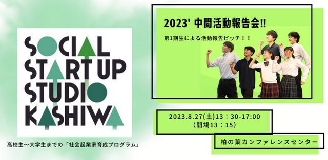 10代~20代の起業家の連続的な輩出を目指す教育プログラム「SOCIAL STARTUP STUDIO KASHIWA」(以下、本プログラム)の中間報告会を2023年8月27日(日)に開催することをお知らせします。報道関係者様で取材をご希望の方はぜひご参加ください。
