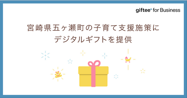 eギフトプラットフォーム事業(※1)を展開する株式会社ギフティ(本社:東京都品川区/代表取締役:太田 睦、鈴木 達哉/以下、ギフティ)は、デジタルギフトを活用した法人および自治体向けサービス「giftee for Business」(※2)を、宮崎県五ヶ瀬町が2023年7月28日(金)より開始する令和5年度「五ヶ瀬町出産・子育て応援給付金交付事業」に採択いただきましたのでお知らせいたします。これに伴い、ギフティは本事業の実施に際して、五ヶ瀬町の特性に合わせた施策の企画・設計を手がけ、「giftee for Business」の主力プロダクト「giftee Box(R)」(※3)を、対象者に給付されるデジタルギフトボックスとして五ヶ瀬町オリジナル仕様にカスタマイズした出産応援ギフト「わくわく赤ちゃんギフト」、子育て応援ギフト「すくすく赤ちゃんギフト」を提供しております。また、確実なギフト給付を実施する手段として、対面でのデジタルギフト付与を効果的かつ効率的に実施するキャンペーンツール「giftee Direct」(※4)を提供いたしましたので、併せてお知らせいたします。