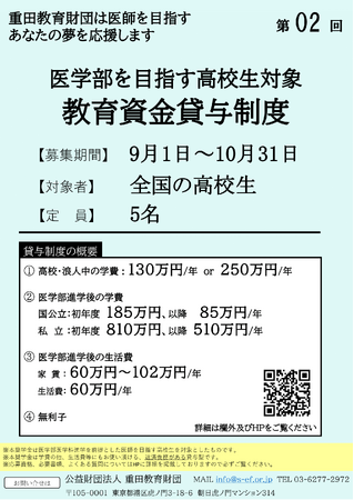 公益財団法人重田教育財団(所在地:東京都港区、代表理事:重田康光)では、高校から医学部医学科卒業までの教育資金を無利子で貸与します。