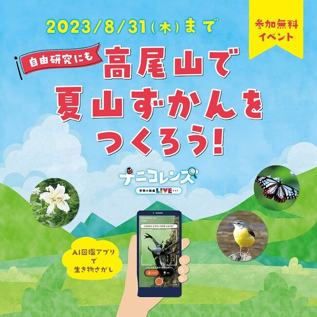 株式会社 学研ホールディングス(東京・品川/代表取締役社長:宮原博昭)のグループ会社、株式会社 Gakken(東京・品川/代表取締役社長:五郎丸徹)は、2023年7月23日(日)~2023年8月31日(木)の約1か月間、高尾山(東京・八王子)にて、AI図鑑アプリ『ナニコレンズ』を使った親子向けイベントを実施いたします。アプリのダウンロード、イベント参加はともに無料です。