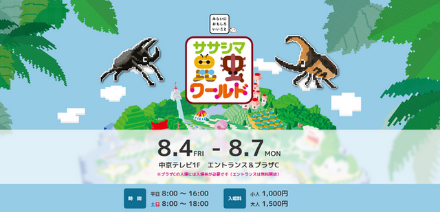 中京テレビ放送株式会社(本社:名古屋市中村区 代表取締役社長:伊豫田祐司)は、2023年8月4日(金)~7日(月)に、昆虫に見て・触って・楽しめる!「ササシマ昆虫ワールド」を開催します。