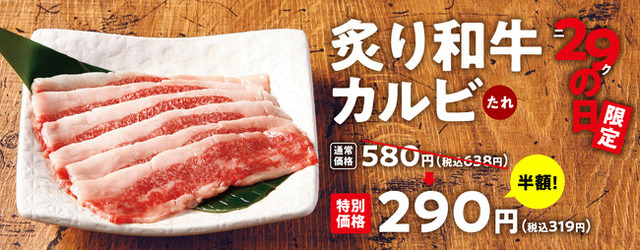 毎月29日の恒例企画となりました「ニクの日」。この度ご提供させていただく限定商品は2023年7月26日(水)より販売開始となりました「極味-KIWAMI-」メニューの「炙り和牛カルビ」です。その名の通り炙るようにサッと焼いてお召し上がりいただくことで、口の中でとろける黒毛和牛の脂の旨味と引き締まった赤身の絶妙なバランスをご堪能ください。現在、通常価格1皿580円(税込638円)でご提供しておりますところ、7月29日(土)限定で何皿ご注文いただいても通常価格の半額となる1皿290円(税込319円)でご提供いたします。是非この機会にお立ち寄りください。