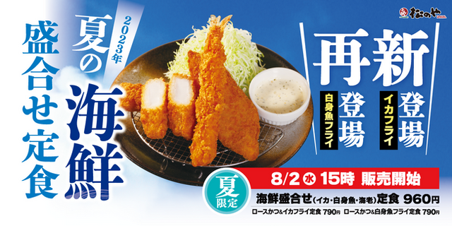 株式会社松屋フーズ(本社:東京都武蔵野市、代表取締役社長:瓦葺 一利)では、とんかつ専門店の「松のや」におきまして、2023年8月2日(水)午後3時より、「イカフライ・白身魚フライ」を発売いたします。