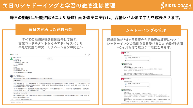 ・内容 学習計画作成、週一回の1対1でのオンライン指導、毎日のシャドーイングチェック