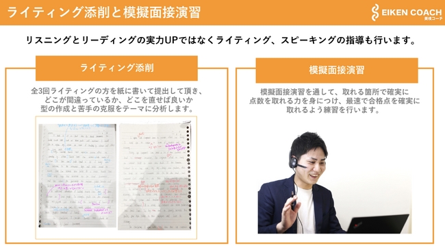 英検コーチは英検合格者である先生にとの模擬面接演習からライティング添削も実施して、英検最短合格に向けて最大限のサポートを行なっております。特にライティング添削を通しての弊塾の英検準一級合格率の高さは競合の塾に負けない強みとなっています。