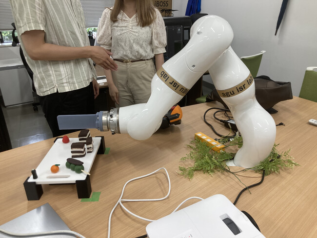 はじめに、機械創造工学科 知技能ロボティクス研究室(https://www.agnes.aoyama.ac.jp/me/tasaki/) 田崎良佑先生の研究室で、最新のロボット研究について説明していただきました。感触の違う食材をカットするロボットや、マッサージ施術者の手の動きを再現して、マッサージしてくれるロボット等がありました。中でもおもしろかったのは、自動で顔に化粧をしてくれるロボットです。人間の骨格やフェイスラインは一人ひとり異なりますが、ロボットが視覚的に判断して、適切な強度でアイラインを描いてくれるそうです。実用化はまだ先のようですが、ロボットが身近なところで生活を助けてくれる未来はすぐそこにあると感じました。