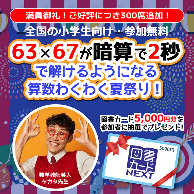 前回2023年5月に開催したタカタ先生の無料イベントでは、定員上限を超える約500名の小学生の申込があり、暗算のスゴ技を伝授するとともに多くの小学生に算数の楽しさを体験してもらいました。