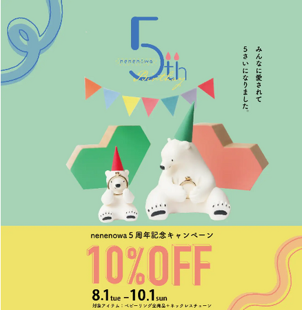 株式会社encochi(所在地:大阪府大阪市、代表:矢野賢二)が展開するベビーリングの専門店nenenowa(ネネノワ)は、2023年8月で5周年を迎えます。5年間支えていただいたお客様に感謝して、nenenowaとして初めて、 全てのベビーリングとネックレスチェーンが10%OFFで購入できる「5周年記念キャンペーン」を開催いたします。