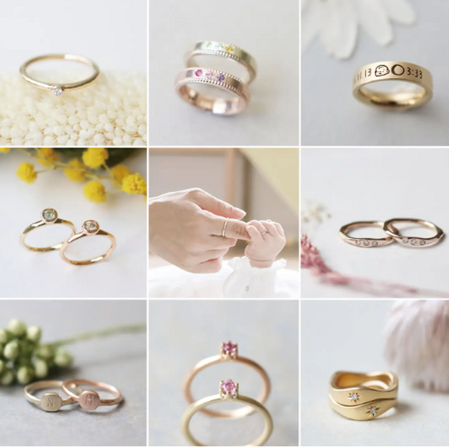 2段目左:nene 24,200円~、2段目中央:親子リング 52,800円~、2段目右:yorisoi 25,300円