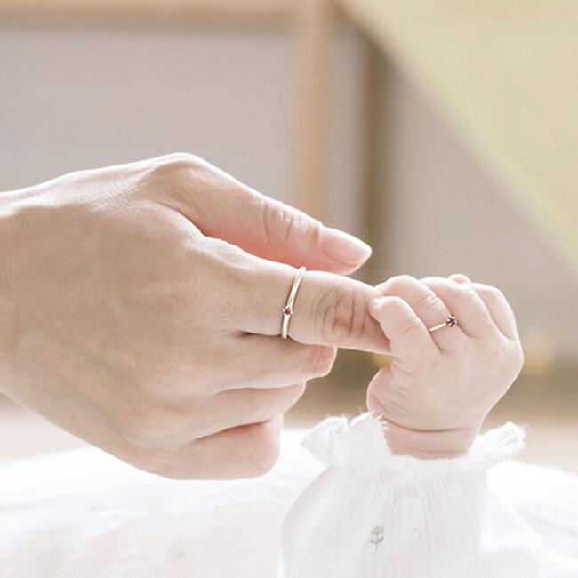 ベビーリングとは、赤ちゃんサイズの小さな指輪のこと。ヨーロッパで広まっている「銀のスプーンをくわえて生まれてきた赤ちゃんは幸せになる」という言い伝えが由来で、銀のスプーンから転じてリングを渡すようになりました。