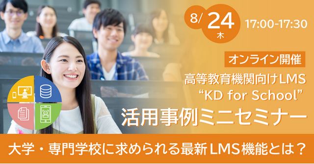 本セミナーでは、通信制大学様のノウハウをもとに、通学、通信、リカレント教育にも使っていただけるよう、これまでカスタマイズしてご提供してきた機能「KnowledgeDeliver for School」(以下、KD for school)をご紹介いたします。ウィズコロナ、アフターコロナの状況でも学びを止めないための工夫や受講者様、管理者様に便利な機能をご参照ください。