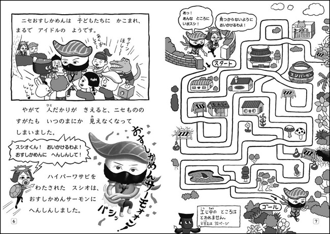 なぞなぞや間違い探し、ダジャレ、パズル、迷路などのさまざまな「あそび」をモチーフにした低学年向け読み物「おすしかめんサーモン」シリーズ。第1巻『きょうふ!なぞなぞニギリーランド』は2021年7月に発売され、「あそび」要素だけでなく、お寿司をモチーフにしたキャラクターの笑いあり涙ありのエピソードも楽しめるということで、子どもたちから人気を集めました。現在、紙版のシリーズは第3巻まで発売され、2023年5月には電子書籍短編読み物エピソード『しりとりかい人とおかしな国』も配信されました。