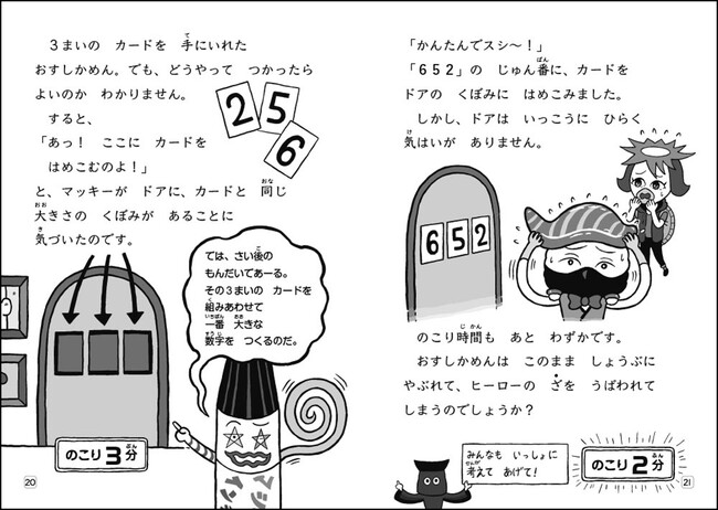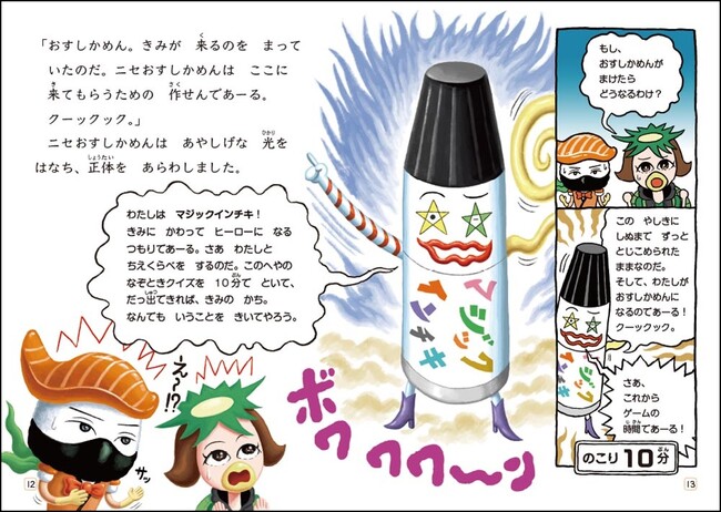 第3巻『ドッキリ! だまし絵パズルじま』の発売を記念して、2022年夏に開催された「オリジナルキャラクターコンテスト」の最優秀賞に輝いたキャラクター、マジックインチキがおすしかめんと対決するシーンもあり。ふたりの対決の行方にもご注目ください。