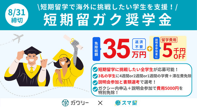 総額35万円分の留学費用免除、説明会への参加者全員にスマ留で使える5,000円割引クーポンで皆様の留学をサポートしたいと考えております。様々な学生様のご応募をお待ちしております。