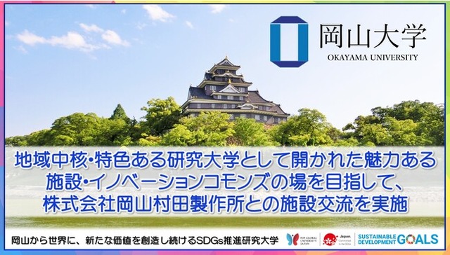 国立大学法人岡山大学(本部:岡山市北区、学長:那須保友)は、2023年7月4日、従来のイメージに捉われない魅力溢れる産学共創イノベーション拠点の施設整備に向けた知見を得るため、岡山県瀬戸内市にある株式会社岡山村田製作所を訪問しました。同社の施設は地域との交流に積極的であるとともにさまざまな仕組みを組み込んだ先駆的なイノベーション施設などであることから、今回の訪問となりました。