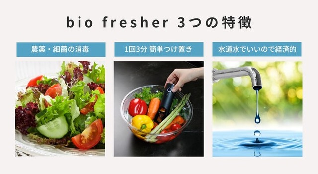 ご家庭の水道水を入れた容器にbio fresherと野菜や果物をつけ置きするだけ!
