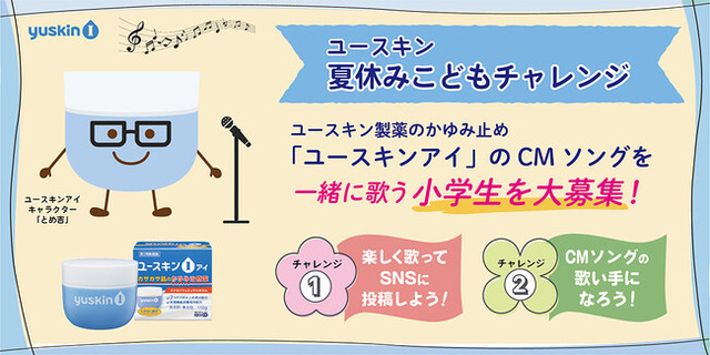 ユースキン製薬株式会社(本社:川崎市川崎区、代表取締役社長:野渡和義)は、この度、乾燥からくるかゆみを止める治療薬「ユースキンI(アイ)」(第3類医薬品)のCM動画を制作し、この秋にTVerにて放送する予定です。それに伴い、夏休みこどもチャレンジとして、CMソングを一緒に歌ってくれる小学生を大募集します。