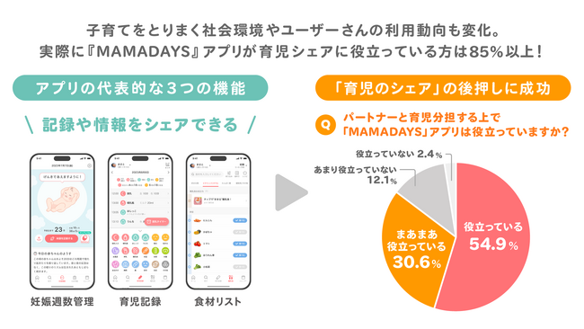 『MAMADAYS』アプリでは、子育てをパートナーや両親などの親族と共有できる機能を搭載し、育児シェアをサポートしてきました。実際にシェア機能の利用率は、開始当初から2.6倍に増え、妊娠週数管理や育児記録、離乳食の食材リストなどを利用している世帯を中心にシェアニーズが高まっていることが分かっています。