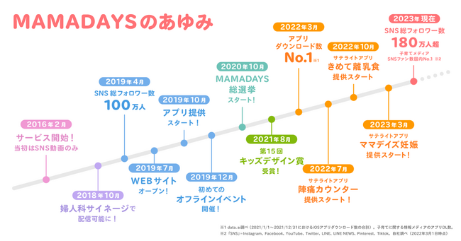 『MAMADAYS』は 「育児をもっと楽しくもっと幸せに」をコンセプトとしたファミリー向け動画メディアです。2016年にSNSからサービスを開始し、2019年にはフォロワー数が100万人を突破。同時にウェブ・アプリサービスの提供をはじめ、2022年には子育てに関する情報メディアとしてアプリダウンロード数No.1を達成しました。以降、妊娠期から産後、育児までそれぞれの時期のユーザーに最適化された機能や情報を提供するサテライトアプリをリリース。現在、シリーズ累計アプリダウンロード数は90万以上、SNSフォロワー数は180万人以上と合計270万人以上の方にご利用いただいています。