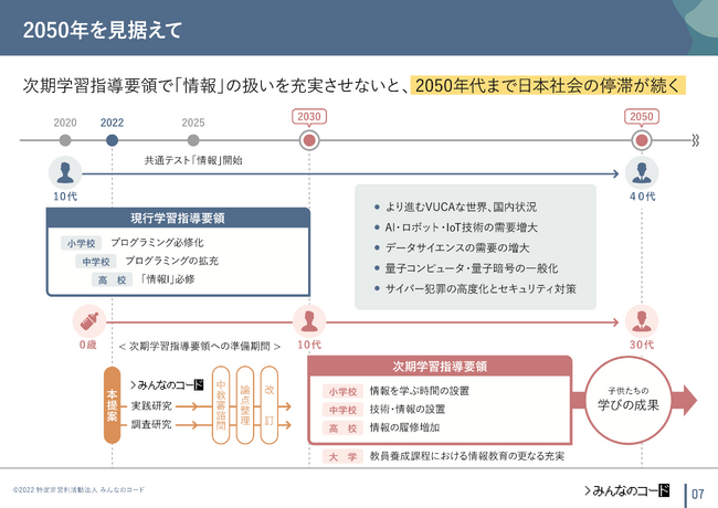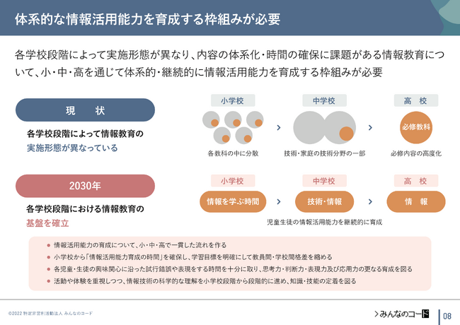 みんなのコードは、2020年から宮城教育大学附属小学校と連携し、3年間にわたってコンピュータサイエンス科での共同研究等を行ってきました。これらの実践を踏まえ、次期学習指導要領において、小中高を通じた体系的・継続的な情報活用能力を育成する枠組みが必要であると考え、2022年4月には「2030年代の情報教育のあり方についての提言」を発表しました。
